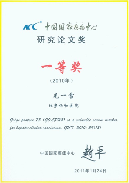 我肝脏外科教授毛一雷日前在中国国家癌症中心成立暨优秀论文评奖会上,以《Golgi protein 73 is a valuable serum marker for hepatocellular carcinoma》论文参赛,经国内专家综合评审,认为研究质量高,有重大的临床意义,在该领域里国际上处领先水平。荣获研究论文一等奖。
